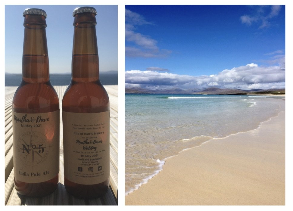 If you have been following our blog from the start you will know that we have an almost masochistic urge to do everything ourselves. Of course we brew the beer ourselves, and it makes sense, at least to us, that we print and label our beers by hand as it means we never have to change a beer to match a pre-printed label, we print labels to match the beers. This idiosyncrasy has had an unexpected benefit during lockdown as we could change recipes when ingredients became unavailable. You may have wondered how our N˚9 Brown Ale became a "Light" Brown Ale and now you know! We also knew that at some stage we would like to offer a bespoke label service and this month we were delighted to be asked to provide bespoke beers for the wedding of Martha and Dave which took place on Scarista beach. They chose three different styles of beer and we designed and printed special labels for their guests to enjoy a personalised toast. We loved how they turned out so we made some more bespoke labels for another very special event our son Charlie's 18th Birthday! This service will now be available on request for all of our beers with ten weeks notice. If you have a special event coming up drop us an email and we will send you some samples (of labels not beers!)