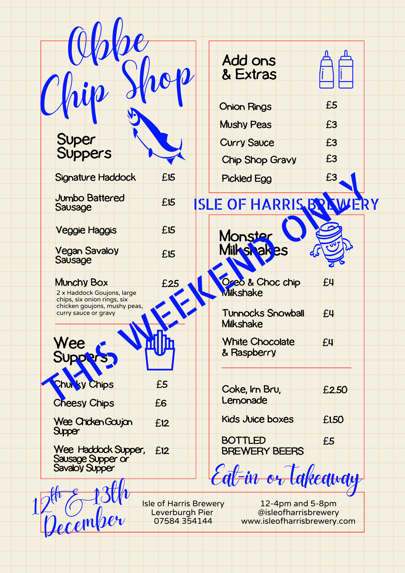 In our taproom we offer a casual lunch and dinner menu on a Friday & Saturday featuring the very best local produce & Scottish pub classics. We can seat up to fifty in our taproom and when the Hebridean weather allows there are extra tables on our shorefront deck.